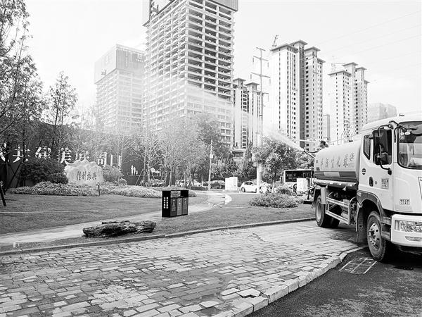 8月18日中午,园林工人驾驶喷水车在市中心城区八一大道与文昌大道交叉口附近为花木、草坪浇水降温,确保绿化植物健康生长。记者 张洪涛 摄