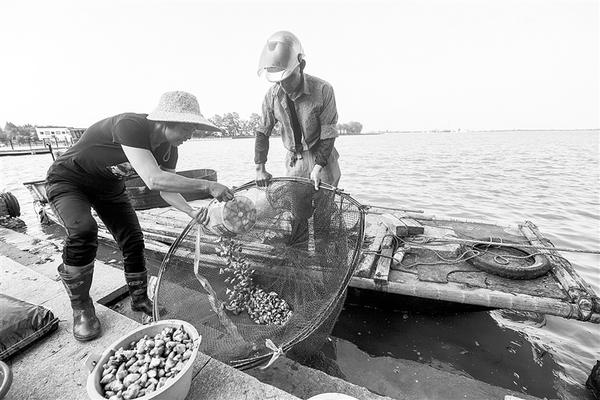 8月19日,在浙江省嘉兴市秀洲区油车港镇西千亩荡,菱农们清洗刚采摘的菱角。