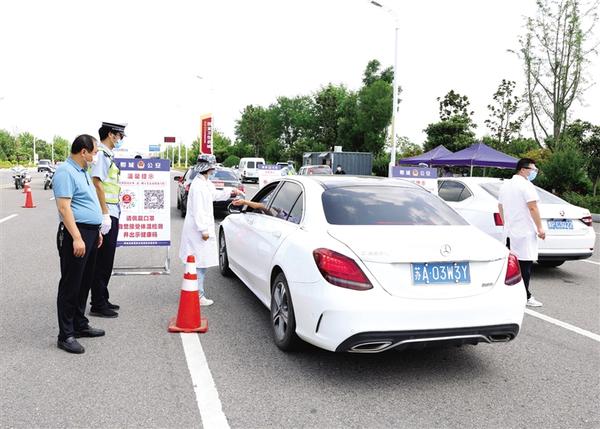 文昌大道与郸城县迎宾大道交叉口是从周口方向到郸城的必经路口,也是最为重要的卡点。公安部门派出何涛、赵阳、赵志博等25名交警在这里轮岗值守,交通部门派出张石磊、郑红坤等8位精兵强将,卫健部门派出于明杰、刘欣等8位医护人员严把检测关,确保不漏一车、不漏一人。
