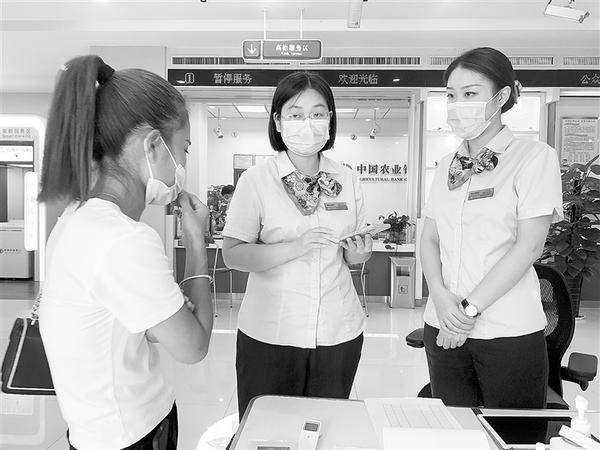 ②近日,农行周口分行疫情防控和防电诈宣传两手抓,各营业网点加强通风设施和消毒设备的配备管理,每天定时进行消毒,发放反电诈宣传折页。图为8月25日,农行八一路支行大堂工作人员正在向客户讲解防骗知识。