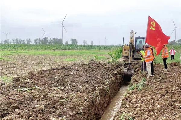 8月25日,西华县艾岗乡官庄村利用晴好天气,抓紧时间挖沟排涝,加速推进灾后重建工作。图为施工现场。