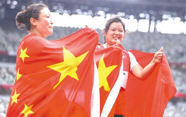 田径——女子铁饼F64级决赛:中国选手包揽冠亚军 8月29日,中国选手姚娟(右)与杨月在比赛后庆祝。当日,在东京残奥会田径女子铁饼F64级决赛中,中国选手姚娟以44米73的成绩刷新世界纪录并夺得冠军,杨月获得亚军。
