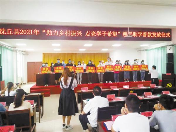 8月31日,由沈丘县民政局、县慈善总会等联合举办的2021年“助力乡村振兴 点亮学子期望”慈善助学善款发放仪式举行。善款发放仪式上,有关负责人为该县241名贫困大学生分别发放数额不等的助学金,帮他们圆大学梦。记者 韦伟 摄