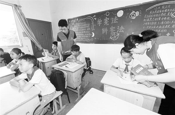9月9日,青年志愿者在东林镇第二小学给学生们发普法宣传资料。