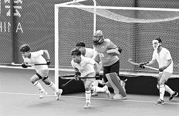 9月15日,江苏队球员在球门前防守。当日,在西安举行的第十四届全运会曲棍球项目男子小组赛B组比赛中,甘肃队以5比2战胜江苏队。