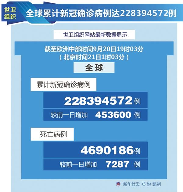 世卫组织:全球累计新冠确诊病例达228394572例