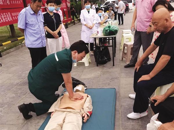 急诊科的医务人员以模拟操作的方式,现场演示心肺复苏的具体操作要领,并引导群众操作学习(如图)。