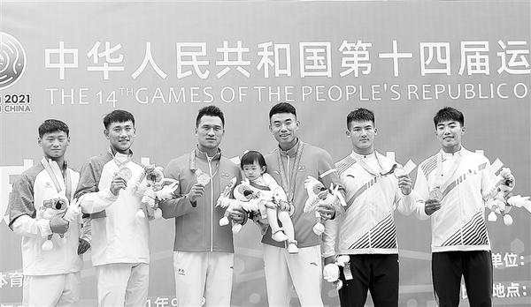 9月23日,冠军联合队组合刘浩(左三)/郑鹏飞(右三)、亚军浙江一队组合缪飞龙(左一)/季博文(左二)、季军广东二队组合禤嘉良(右二)/王梓航在颁奖仪式上合影。当日,第十四届全运会皮划艇静水男子1000米双人划艇决赛在陕西杨凌举行。新华社发