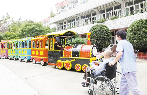 10月14日,一名老人在工作人员协助下准备乘坐小火车。当日,一场趣味重阳游园会在上海市杨浦区社会福利院举行。旋转木马、小火车和可爱美拍照相屋等娱乐设施被搬进了福利院,给老人们带来欢乐。新华社记者 方喆 摄