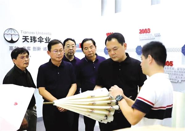 李全林一行还先后深入到伞艺产业中心、华联印染、友谊菲诺、天玮伞业等企业就伞业发展情况、运营模式及远景发展规划等进行考察。