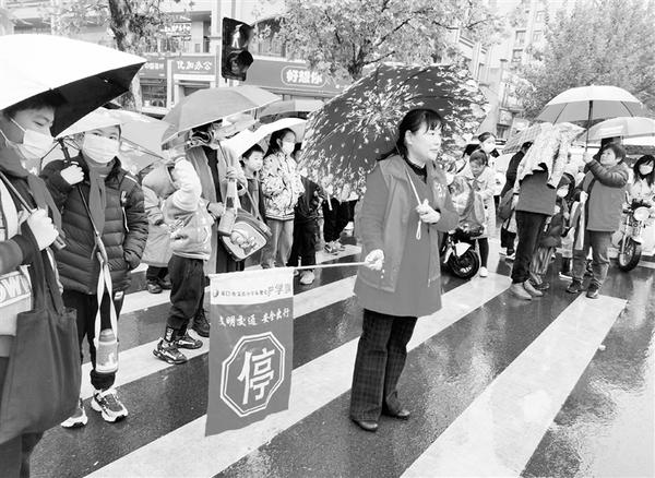 10月20 日早上,市文昌小学部分学生家长冒雨走上街头,加入志愿护学岗,助力文明城市创建工作。 记者 孙安平 摄
