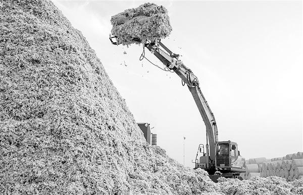 在新疆沙湾市的一家棉花收购厂,工人把刚收购的新棉堆垛(10月20日摄)。