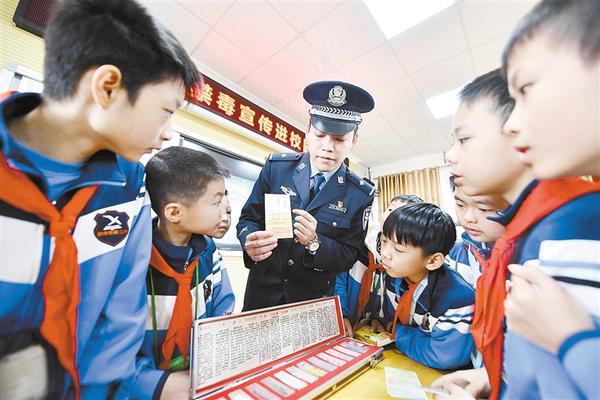 10月27日,在广西融安县第二实验小学,民警向学生们讲解禁毒知识。