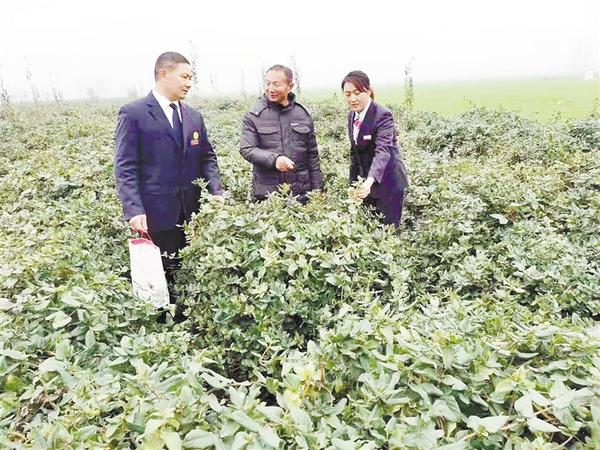 商水农商银行巴村支行工作人员到种植户刘某的金银花种植基地了解金银花长势及资金需求。李叶 摄