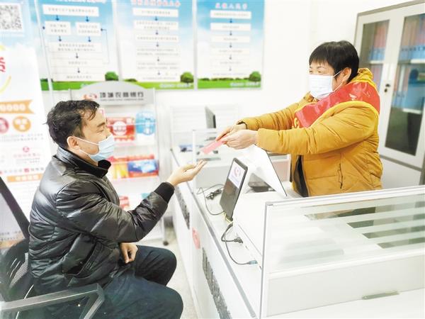 一段时间以来,项城农商银行在辖区各行政村设立普惠金融工作站。图为普惠金融工作站工作人员为群众办理惠农补贴领取业务。黄辽仿 摄