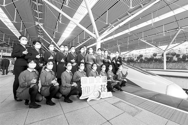 12月10日,深圳北站工作人员在深圳北站开往南昌西站的首班列车前留影。当日,京港高铁赣州至深圳段开通运营。开通后,南昌、赣州至深圳的最快旅行时间分别由4小时42分、5小时32分压缩至3小时30分、1小时49分,江西与粤港澳大湾区间形成快速客运通道,赣闽粤原中央苏区将迎来发展新机遇。京港高铁赣深段北起江西省赣州市,南至广东省深圳市。线路全长434公里,设计时速350公里,全线共设13座车站。新华社记者 毛思倩 摄