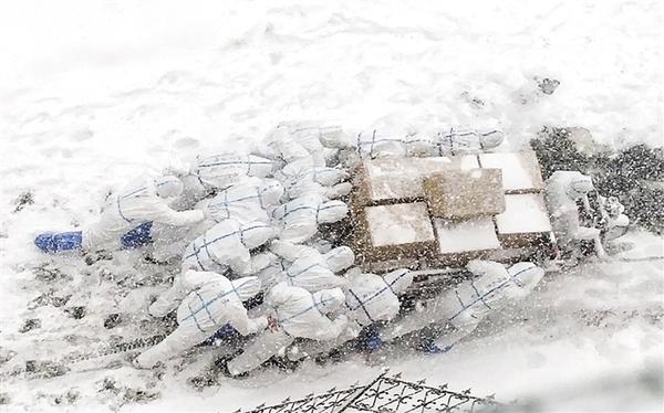 ② 1月6日,在因新冠肺炎疫情被封闭的大连海洋大学校园内,志愿者推着满载的三轮车上坡,将物资送往学生宿舍。