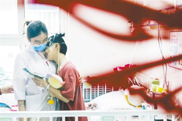 ⑤ 5月26日,一名患儿在北京儿童医院肿瘤外科的病房内拥抱医护人员。