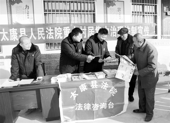 12月21日,太康县人民法院组织法官深入马厂镇聂楼行政村、田楼行政村,为广大群众送去法律知识“大餐”,并对群众提出的法律问题认真答疑释惑。该活动取得了良好的法律效果和社会效果。图为该院法官为群众发放法律宣传资料。