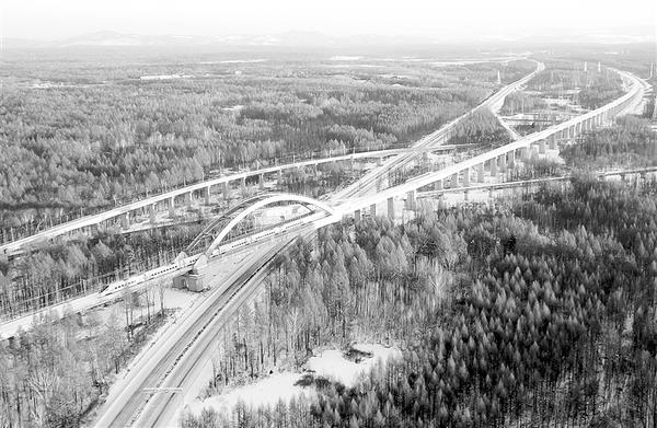 沈佳高铁白敦段位于吉林省延边朝鲜族自治州境内,设计时速250公里,由于其穿越原始森林,被誉为“森林高铁”。新华社发(刘慎库 摄)