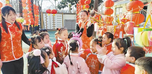 为了更好地继承和弘扬中华优秀传统文化,12月30日上午,周口市实验幼儿园举办“快快乐乐迎新年、喜气洋洋‘赶庙会’”活动,在寓教于乐中,让孩子们切身感受中国传统庙会的文化内涵和独特魅力。图为老师正带领孩子在幼儿园里“赶庙会”。记者 王珂 通讯员 张黎 摄