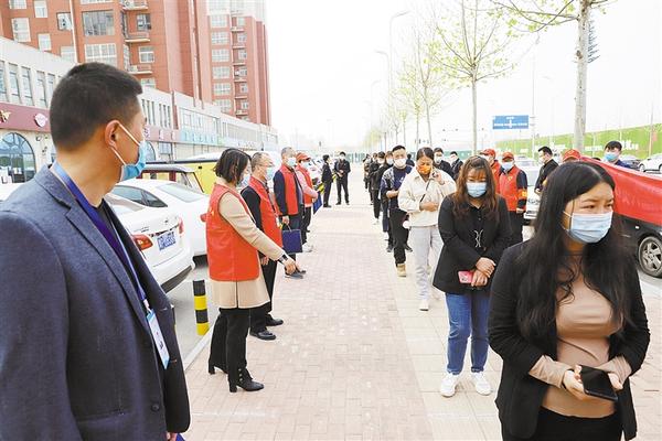 本报讯 (记者 宋风 文/图) 为落实市疫情防控指挥部关于重点人群及重点场所从业人员每周2次核酸检测要求,4月5日,市市场监管局港区分局组织辖区商超、餐饮店、药店、快递公司从业人员,市场监管和城管一线工作人员开展定期核酸检测(如图)。