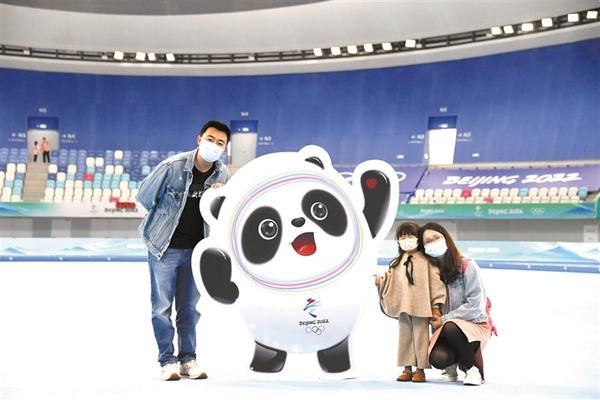 图为建设者张博伟(左)与家属在国家速滑馆“冰丝带”内与“冰墩墩”合影留念。新华社记者 任超 摄