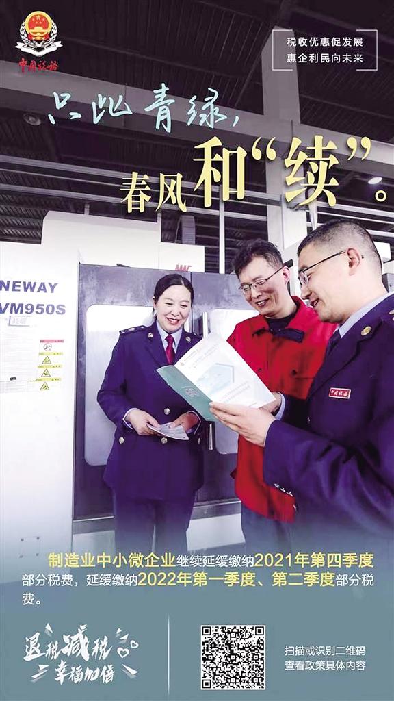 政策内容:(一)继续延缓缴纳2021年第四季度部分税费。《国家税务总局 财政部关于制造业中小微企业延缓缴纳2021年第四季度部分税费有关事项的公告》(2021年第30号)规定的制造业中小微企业延缓缴纳2021年第四季度部分税费政策,缓缴期限继续延长6个月。(二)延缓缴纳2022年第一季度、第二季度部分税费、制造业中型企业可以延缓缴纳规定的各项税费金额的50%,制造业小微企业可以延缓缴纳规定的全部税费,延缓的期限为6个月。延缓缴纳的税费包括所属起为2022年1月、2月、3月、4月、5月、6月(按月缴纳)或者2022年第一季度、第二季度(按季缴纳)的企业所得税、个人所得税、国内增值税、国内消费税及附征的城市维护建设税、教育费附加、地方教育附加,不包括代扣代缴、代收代缴以及向税务机关申请代开发票时缴纳的税费。