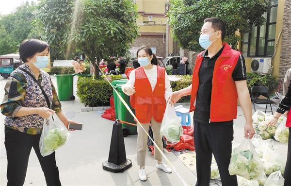 新一轮疫情突然来袭,周口中心城区广大市民响应号召,居家不外出,每天进行核酸检测;党员干部争做志愿者,助力小区防疫;医护人员早出晚归分赴各小区进行核酸采样……图为志愿者为小区居民分发蔬菜。记者 孙安平 摄