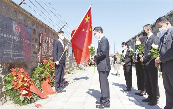 5月15日,在奥地利毛特豪森集中营纪念馆,中国驻奥地利大使馆代表向遇难中国同胞纪念牌敬献花圈。
