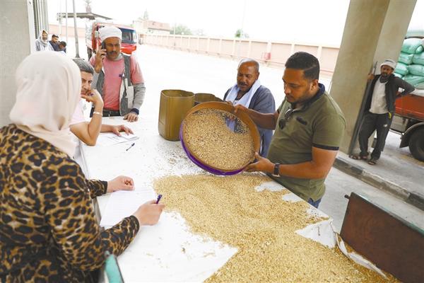 5月16日,在埃及本哈,收购小麦的人员检查小麦质量。