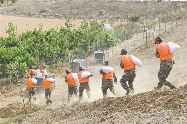 现场模拟河堤出现管涌,抢险队员采取行动对管涌洞口进行沙石填塞。