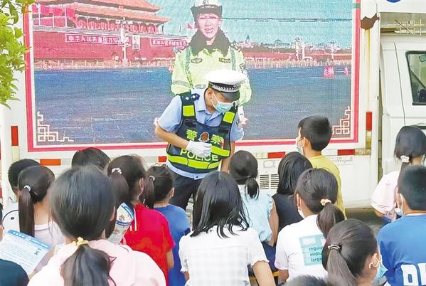 近日,为了深入开展“美丽乡村安全行”交通安全主题宣传活动,项城市公安局交警大队民警先后深入到南顿镇荣楼桥、高楼小学等处,认真开展电影下乡“美丽乡村行”巡回宣讲活动。图为民警正在进行电影下乡“美丽乡村行”巡回宣讲。 记者 陈军强 摄
