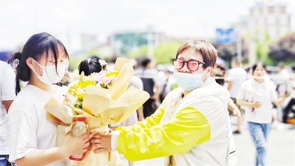 日前,记者从项城市招生考试中心获悉,2022年项城市中招考试报名人数30685人,其中九年级共报考14460人,设10个考点、482个考场;八年级(即初二)共报考16225人,设12个考点、541个考场。图为6月22日上午,在项城三高考点,一位家长为刚下考场的孩子送上鲜花。