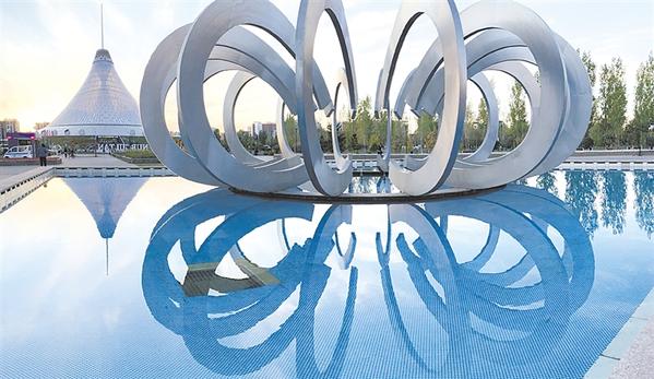 这是在哈萨克斯坦努尔苏丹拍摄的雕塑和远处的“可汗之帐”购物中心。 哈萨克斯坦共和国首都为努尔苏丹。新华社发