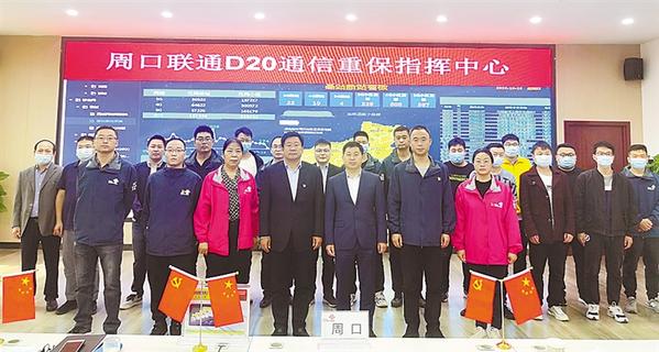 1.在通信重保指挥中心,周口联通公司党委书记朱智勇(前排左四)和重保网络与信息安全领导小组成员合影。