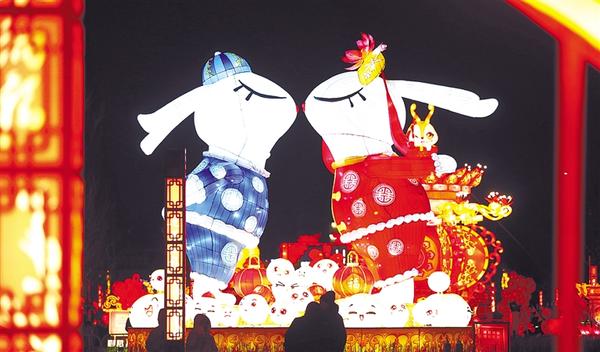这是1月15日在沈阳故宫门前广场拍摄的兔年花灯。