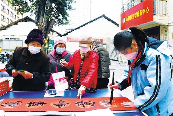 连日来,广西南宁市西乡塘区开展“迎新春 写福字 送祝福”活动,组织一批书法爱好者深入辖区多个行政村和社区,免费为群众书写赠送新春对联和福字,欢欢喜喜迎新年。新华社记者 陆波岸 摄