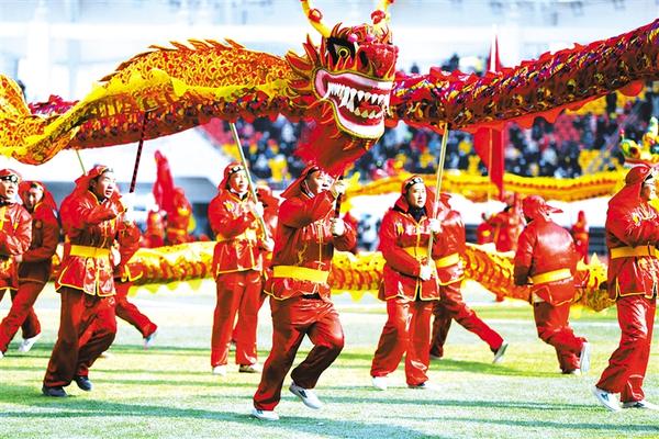 2月5日,社火队员在甘肃省定西市体育场表演舞龙。新华社发