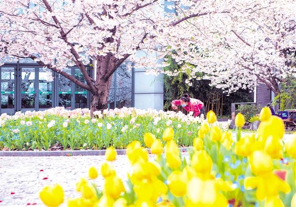 3月23日,一名游客在宁波市植物园内赏花拍照。近日,浙江省宁波市植物园内的樱花、海棠、郁金香等竞相绽放,与垂柳、古建筑等相互映衬,构成一幅幅和美的春景。胡学军 摄(新华社发)