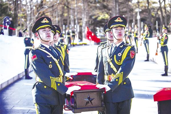 全体人员向志愿军烈士三鞠躬,27名部队官兵鸣枪12响,向英烈致以崇高敬意。《思念曲》再次低回奏响,礼兵们抬起志愿军烈士棺椁,绕广场半周,缓缓走向安葬地宫。自2014年以来,我国连续10年以隆重礼仪迎接总计938位志愿军烈士遗骸归国安葬,让他们回到祖国的怀抱。