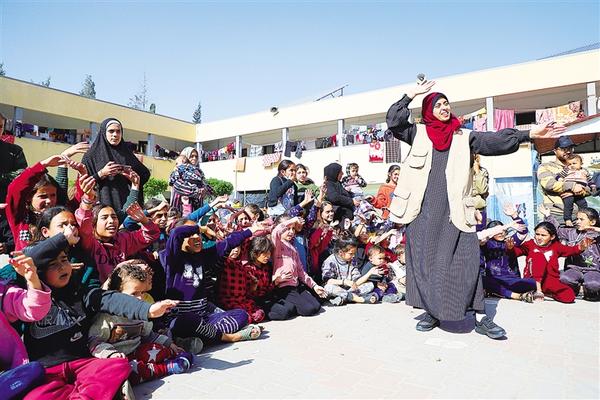 11月23日,在加沙地带南部城市汗尤尼斯,当地志愿者和儿童进行互动。