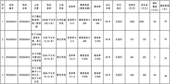 1.HY2024013号地块为公用设施用地,具体建设方案须报规划部门批准后实施,采用拍卖方式无底价出让,土地出让合同签订后,土地成交价款需在60日内缴清,交地时间18个月内,交地后6个月内必须开工建设,工期35个月。