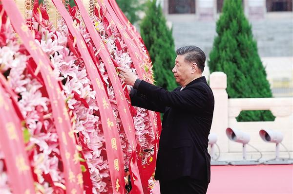 习近平迈步上前,仔细整理花篮缎带。随后,习近平等党和国家领导人缓步绕行,瞻仰人民英雄纪念碑。