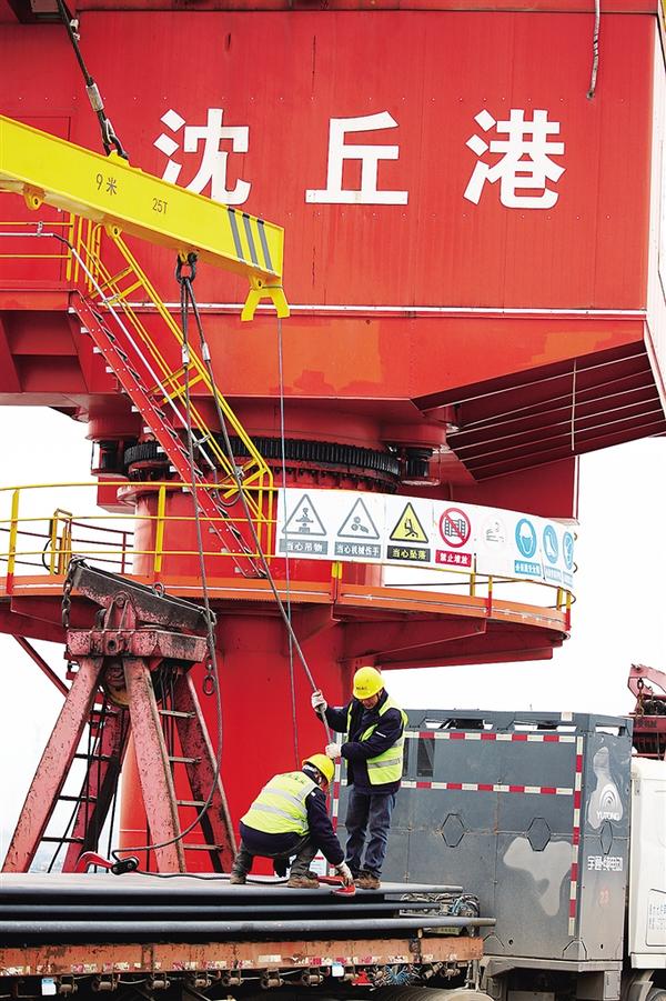 宽厚板项目建成投产后,河南钢铁集团周口基地全力以赴抓好生产经营,加快推进宽厚板产线生产和后续建设工作,并积极主动做好市场营销,持续提升产品竞争力和创效能力。图为1月3日,周口基地生产的板材正在装船,通过水路运往下游企业。记者 刘俊涛 摄