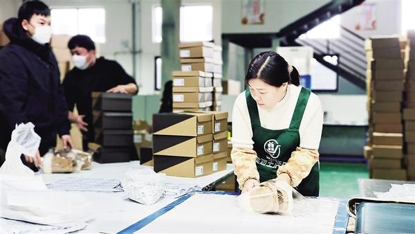 近段时间,项城市多家企业掀起大干热潮,争分夺秒赶订单,全力冲刺一季度“开门红”。图为项城市双强皮业有限公司生产线上的工人赶制订单。