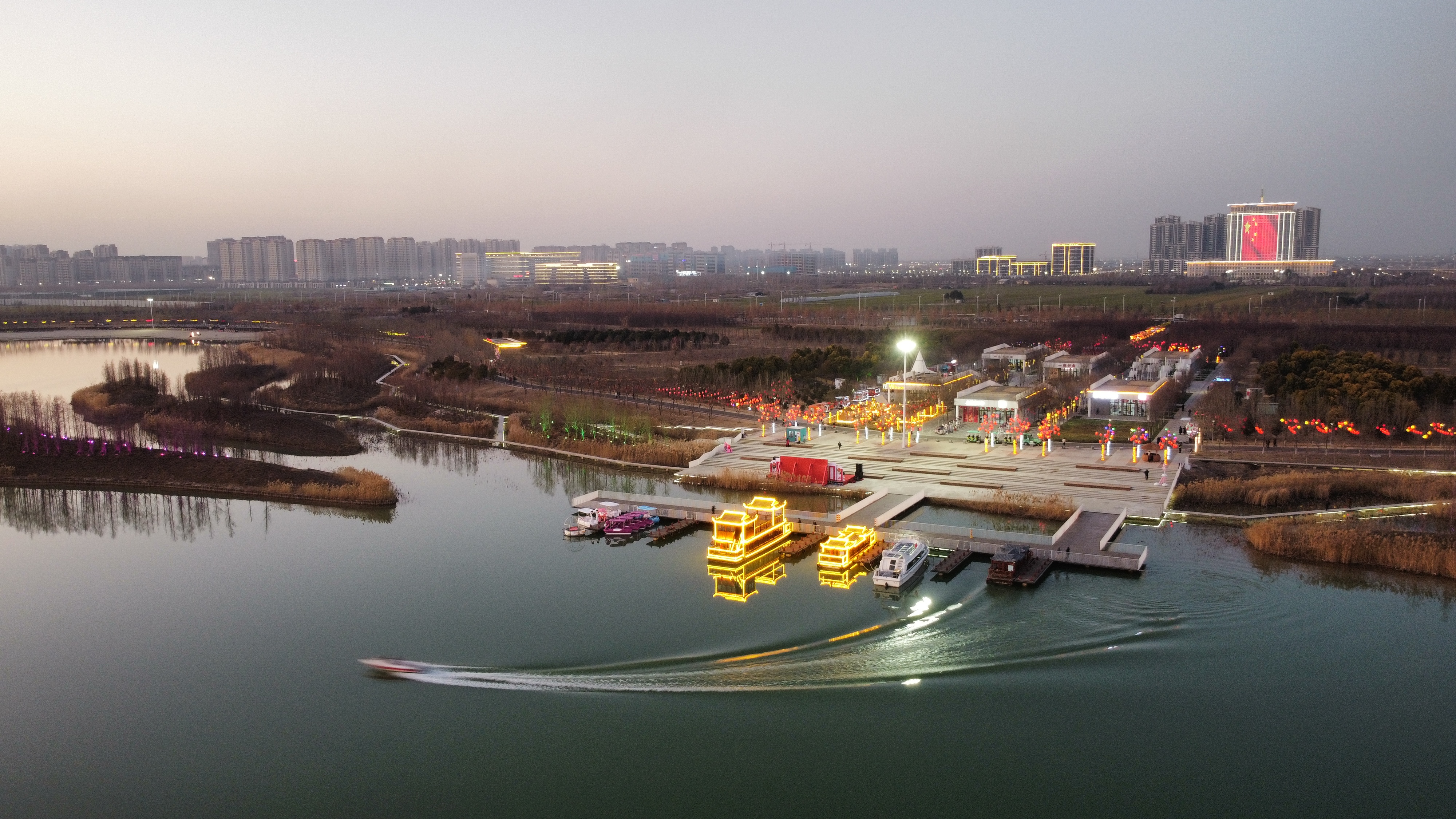 ▼1月14日晚,引黄调蓄湖畔灯火辉煌,一派喜庆祥和的景象。在这里举行的“三川汇永福 乙巳闹新春”新春主题活动准备工作已就绪,众多市民纷纷前来感受新春佳节的美好氛围。记者 刘俊涛 摄