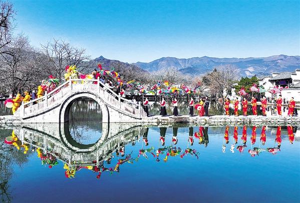 1月18日,民俗表演队伍在安徽省黄山市黟县宏村巡游(无人机照片)。