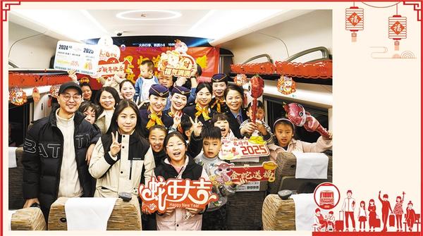 当日,在株洲西开往上海虹桥的G1348次列车上,广铁集团长沙客运段动二车队组织“千里归途服务暖 杜鹃做伴好还乡”主题活动,为旅客们送上节日祝福,让旅客在旅途中感受浓浓的年味。