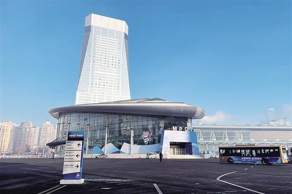 这是2月5日拍摄的第九届哈尔滨亚冬会主新闻中心外景。